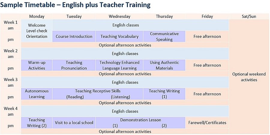 - English + Teacher Training (sample timetable)